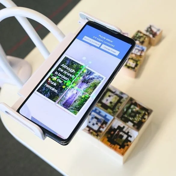When viewed through the phone’s camera, the blocks look like cut-up pieces of an image. The blocks have to be turned the right way and brought together. The image can be anything – a family photo, scenery, a work of art, a funny meme or text such as a whakatauki.